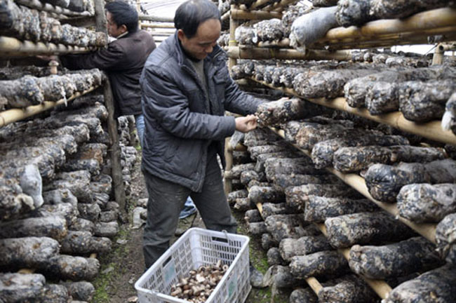采收前一天禁止澆水,適時采收。厚菇應在四五成熟時采收,一般采收均不能超過八成熟。采收時應選擇香菇菌膜自然破裂,菌蓋尚未開傘,邊緣內卷,菌褶伸開的無病變、無畸形的菇體。采收時要用手指輕輕掐住菌柄扭取,不得碰菌褶,輕拿輕放,積壓不得過厚。搬運或置于竹筐時,應避免碰壓變形或破損。剪除菇根,留菇柄長1-2厘米。分揀花菇、厚菇、薄菇,然后按品種與大小不同分裝于盤中,在陽光下暴曬2-3小時,以去除部分水分。