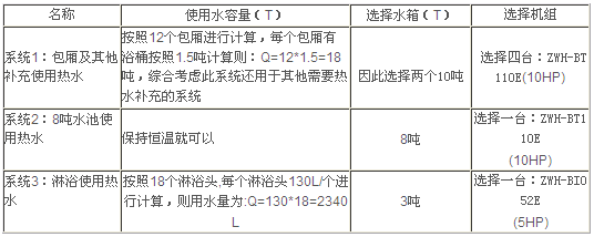 本系統(tǒng)設(shè)計主機為1臺ZWH-BT05E,末端供水采用循環(huán)式加熱式供水,當管路內(nèi)水溫低于設(shè)定溫度時 管路中感溫頭傳送信號增壓水泵及回水管上的電磁閥打開 機組及循環(huán)水泵開始運行加熱,這樣可以保證使用熱水末端隨時都可以用到熱水;