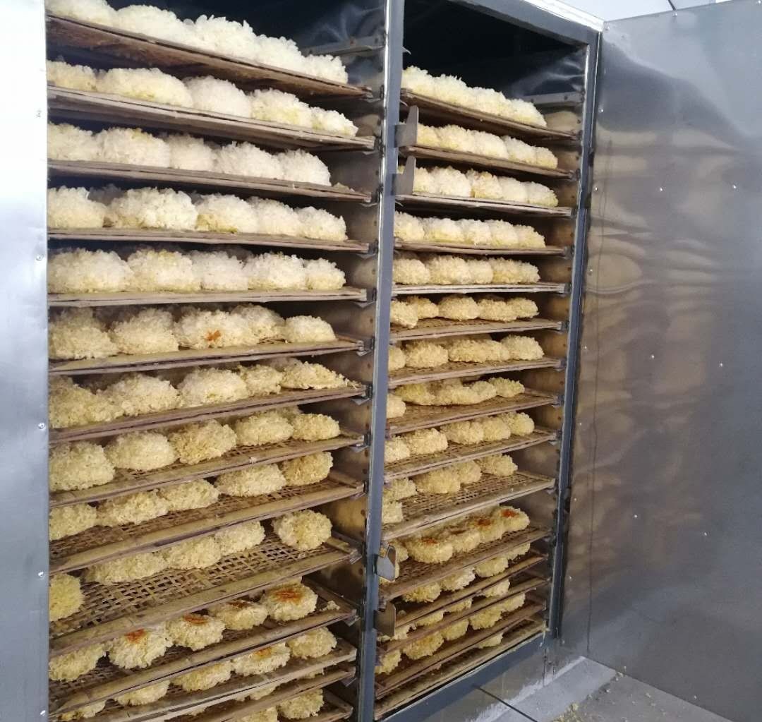 益源食用菌有限公司作為古田縣優(yōu)秀企業(yè)之一,旗下主要產(chǎn)品銀耳干燥加工技術(shù)采用正旭熱泵烘干機(jī)組,銀耳烘干加工流程一般分為清水浸泡—挑選—瀝水—烘干—包裝。采摘下來(lái)的銀耳先用清水浸泡,銀耳會(huì)發(fā)漲飽滿,再挑選出有黑點(diǎn)或腐爛的次品。平均分層裝架,自然瀝水一個(gè)小時(shí)再推進(jìn)烘干房烘干。烤箱溫度控制在60-80度,熱風(fēng)由風(fēng)機(jī)直接吹送到物料表面,確保每層銀耳均勻的通風(fēng)受熱。前四個(gè)小時(shí)濕度非常大,排出的高濕高溫空氣不進(jìn)行循環(huán),及時(shí)的排濕能保證銀耳不變質(zhì)不變色。后四個(gè)小時(shí)烤箱溫度控制在70度以上,烘干到銀耳可捏碎。由于銀耳吸水型比較好,烘干的銀耳要使用包裝袋打包,放于除濕房或冷庫(kù)存放。
