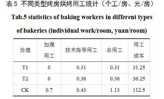 從表5可知,不同處理烘烤用工成本以對照CK最高,為112.5元/房;以處理T1最低,為31.25元/房;處理T2居中,為36.25元。分析比較用工構成,可明顯看出,處理T1和T2與對照CK相比,技術指導用工相差不大;處理T1和T2比對照CK缺少了加煤用工環節,而加煤用工在對照CK總用工量中占有較大比例,因此導致總用工量和成本明顯降低,其中用工成本比對照CK減少了76.25-81.25元/房。處理T2烘烤時間比處理T1長1天,所以用工成本相對較高。