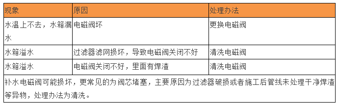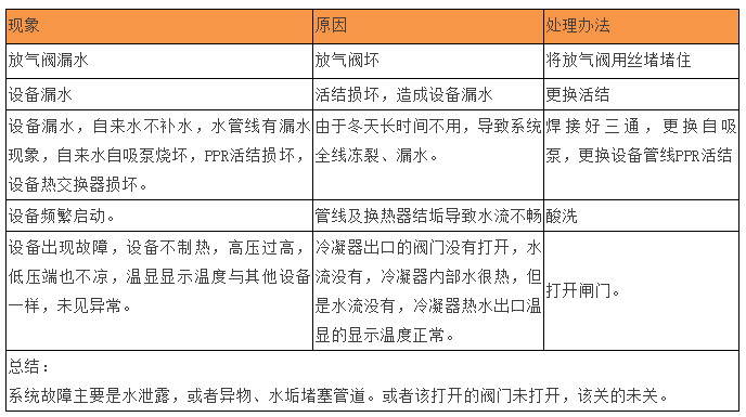 排除:安裝時水箱換熱器的空氣未排盡,就啟動運行,充注同型號冷媒,必須抽真空后再進行充注操作。