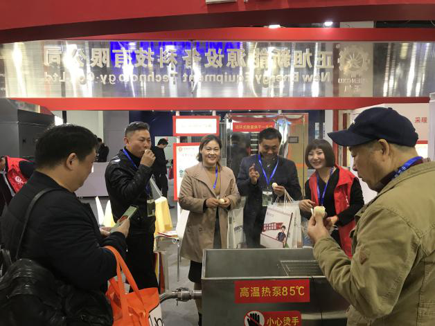 正旭復疊高溫熱泵冷暖機經過多年研究努力,突出空氣能熱泵的技術瓶頸嗎,能夠達到最高95℃。現場高溫熱泵煮雞蛋,吸引了不少客戶前來咨詢觀看,品嘗高溫熱泵煮的雞蛋讓工程商、經銷商們露出滿意的笑容。