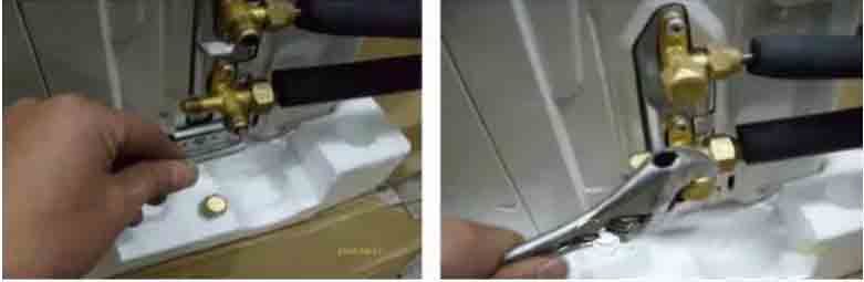 4、 從大閥門上將加氟口處螺帽擰下,加氟管擰到加氟口上,并確認頂針是否頂到位。(禁止使用鉗子等工具擰緊接頭。)