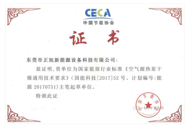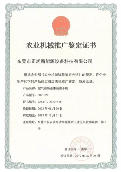 值得一提的是,正旭是國家能源行業標準《空氣源熱泵干燥通用技術要求》主筆起草單位,《熱泵果蔬烘干機》、《空氣源熱泵糧食干燥機》、《空氣源熱泵煙葉干燥機》、《空氣源熱泵烤煙烤房技術規程》、《戶用及類似用途空氣源熱泵采暖機組》等標準起草單位,并連年榮獲《中國熱泵行業十大優秀工農業烘干品牌》稱號。正旭是協同倍增企業,擁有42個專利,其中4項發明專利,7個商標。2017年、2018年公司連年入選“節能產品政府采購清單”,并中標全國多地“煤改電”政府采購項目,獲得三項貴州省農機推廣鑒定證書,是十三五國家重點研發計劃“農特產品綠色節能干燥技術裝備研發”華南地區首家”項目示范基地。 正旭空氣源果蔬烘干機成為《國家補貼機具》,已納入全國20個省市的農機購置補貼目錄