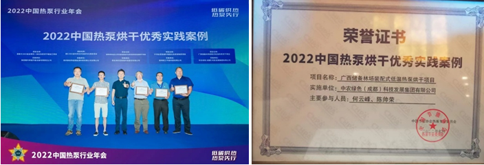 東莞市正旭新能源設(shè)備科技有限公司董事長(zhǎng)陳帥榮女士與中農(nóng)綠色(成都)科技發(fā)展集團(tuán)有限公司集團(tuán)代表何云峰何總共同合作:廣西儲(chǔ)備林場(chǎng)裝配式低溫?zé)岜煤娓身?xiàng)目,榮獲“2022中國(guó)熱泵烘干優(yōu)秀實(shí)踐案例”獎(jiǎng)。