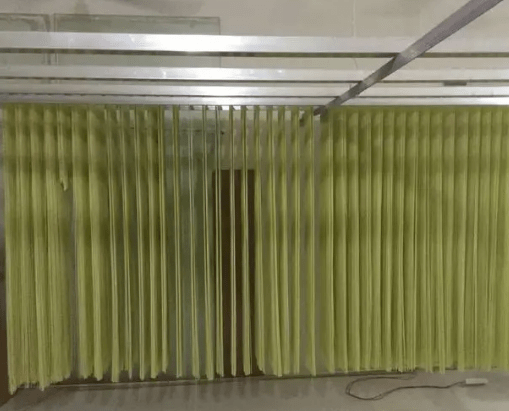 1. 剛進(jìn)入烘干房等待烘干的掛面長(zhǎng)度一般在1.4米左右,水分含量大,可以加強(qiáng)空氣流動(dòng)促進(jìn)面條去濕,使掛面初步定型,此階段烘干時(shí)間約為30分鐘,溫度在26攝氏度左右,濕度在55%-65%之間。