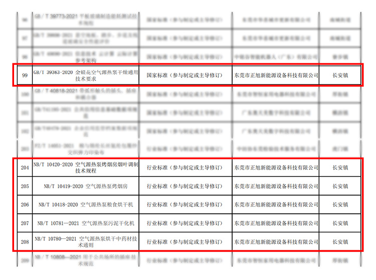 12月5日,東莞市市場監(jiān)督管理局官網(wǎng)發(fā)布了《關(guān)于2022年東莞市促進高質(zhì)量發(fā)展專項資金標(biāo)準(zhǔn)化戰(zhàn)略擬資助項目的通告》,擬對本市符合資助條件的項目進行資助。其中,東莞市正旭新能源設(shè)備科技有限公司憑借參與制定《金銀花空氣源熱泵干燥通過技術(shù)要求》國家標(biāo)準(zhǔn)及《空氣源熱泵烤煙房煙葉調(diào)制技術(shù)規(guī)程》、《空氣源熱泵烤煙房》、《空氣源熱泵糧食烘干機》、《空氣源熱泵污泥干化機》、《空氣源熱泵烘干中藥材技術(shù)通則》五項行業(yè)標(biāo)準(zhǔn)成功入圍。正旭空氣能積極響應(yīng)國家號召,深入貫徹廣東省政府“關(guān)于加快推進質(zhì)量強省建設(shè)的實施方案”精神,以科技創(chuàng)新驅(qū)動新能源行業(yè)高質(zhì)量發(fā)展,在熱泵行業(yè)彰顯正旭擔(dān)當(dāng),貢獻正旭力量。