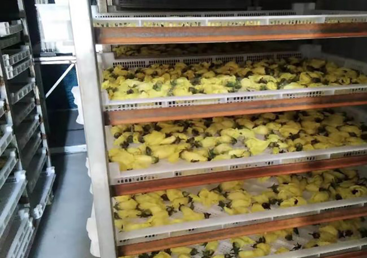 2. 一般農(nóng)戶選擇用炒鍋高溫殺青,此時我們選擇用烘干機殺青,更能保持金花葵原本的香氣。殺青是一個重要環(huán)節(jié),一方面可以高溫滅菌,另一方面可以保留原本香氣,形成良好的的色澤;