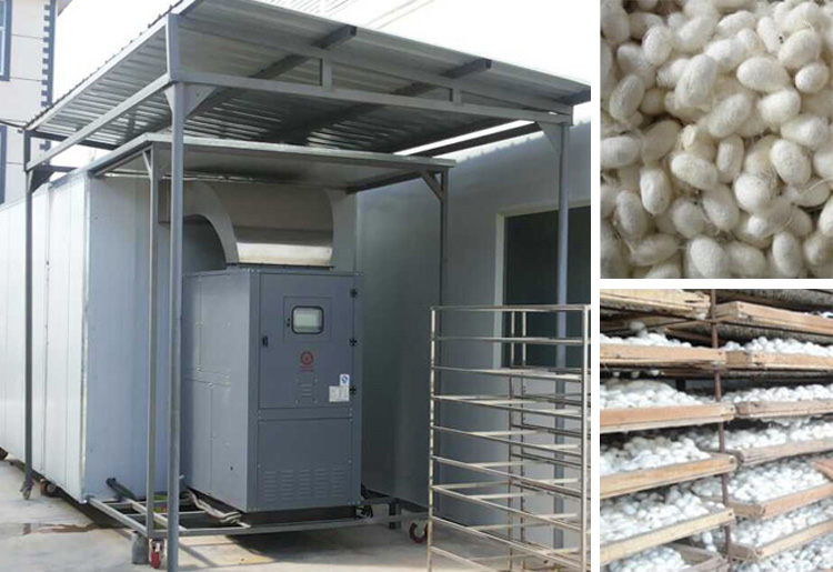 蠶繭內含有蛹體,為防止蠶生長期間化為蠶娥,增加煮蠶的抵抗能力,提高蠶繭利用率,因此需要將蠶繭干燥化,蠶繭中含有大量的水分,正常情況下,繭層含水量在13%-15%,蛹體含水量在73%-77%,所以蠶繭干燥主要是干燥蛹體,蠶層的水分變化不大。隨著現代農業的發展,市場需求也越來越大,對蠶繭的品質要求也越來越高。為了保障蠶繭的品質,提高蠶繭的價值,需要一種先進高效的干燥方式來提升蠶繭品質,熱泵烘干機剛好能滿足這一需求。