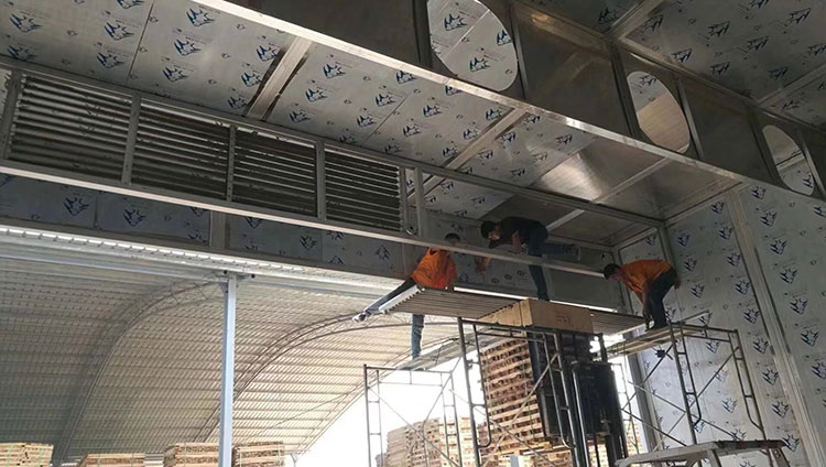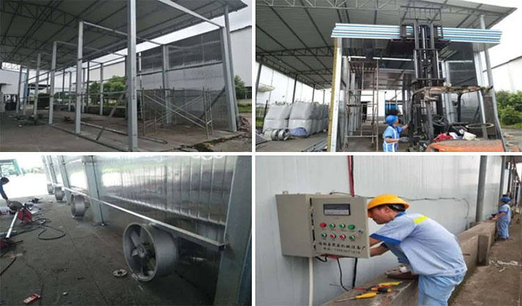 烘干房建造步驟大致可分類:安裝底板 →安裝立板→安裝頂板→安裝底板加強板(方便工人使用推車作業和烘房衛生的打掃)→安裝主機→安裝循環風機→安裝風道板或勻風板→連接電源線和排水管。