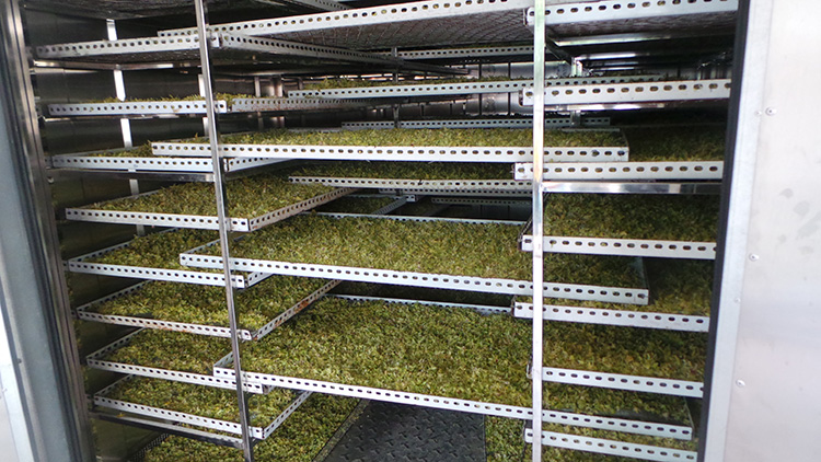 物料烘干是一個(gè)系統(tǒng)工程,烘干房的組成結(jié)構(gòu)從大方面來講分為烘干房箱體以及熱源。烘干房箱體包含有風(fēng)機(jī)系統(tǒng)、溫濕度傳感器、小推車、托盤等。熱泵烘干系統(tǒng)的熱源主要采用的是空氣源熱泵,只需少量電能驅(qū)動它做功,即可為烘干房提供源源不斷的熱量,在風(fēng)機(jī)的作用下形成熱風(fēng),送入到烘干房各個(gè)角落,實(shí)現(xiàn)物料的升溫干燥。